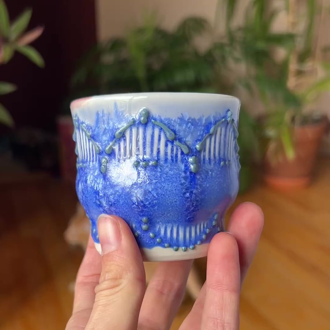 Wheel thrown porcelain sipper cup with bright blue outer glaze and glossy pink liner glaze. It has a textured zig zag pattern created by carved lines and slip trailing. It is microwave and dishwasher safe and holds 6oz.