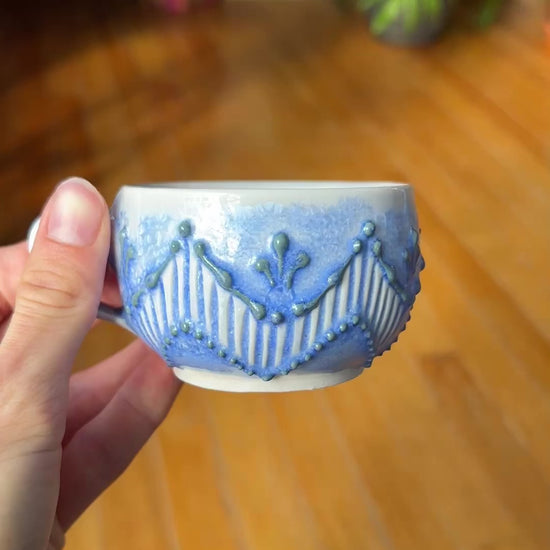 Wheel thrown teacup and saucer set with frosted blue glaze. The inside of the teacup has a glossy white glaze. They are decorated with a textured zig zag pattern created by carved lines and slip trailing. This set is microwave and dishwasher safe, and the teacup holds 4oz.