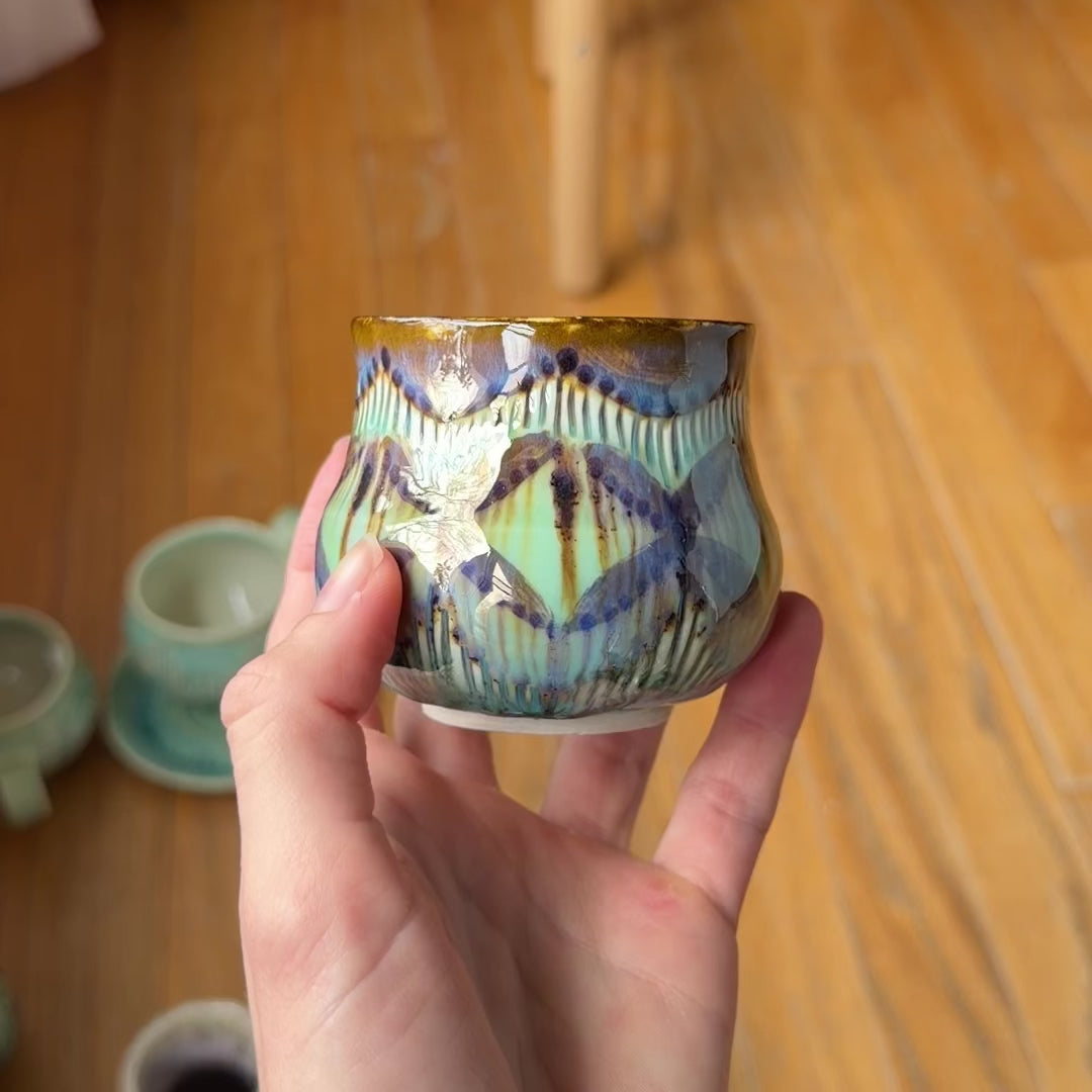 A wheel thrown porcelain sipper with a geometric design created by carved lines and iron.