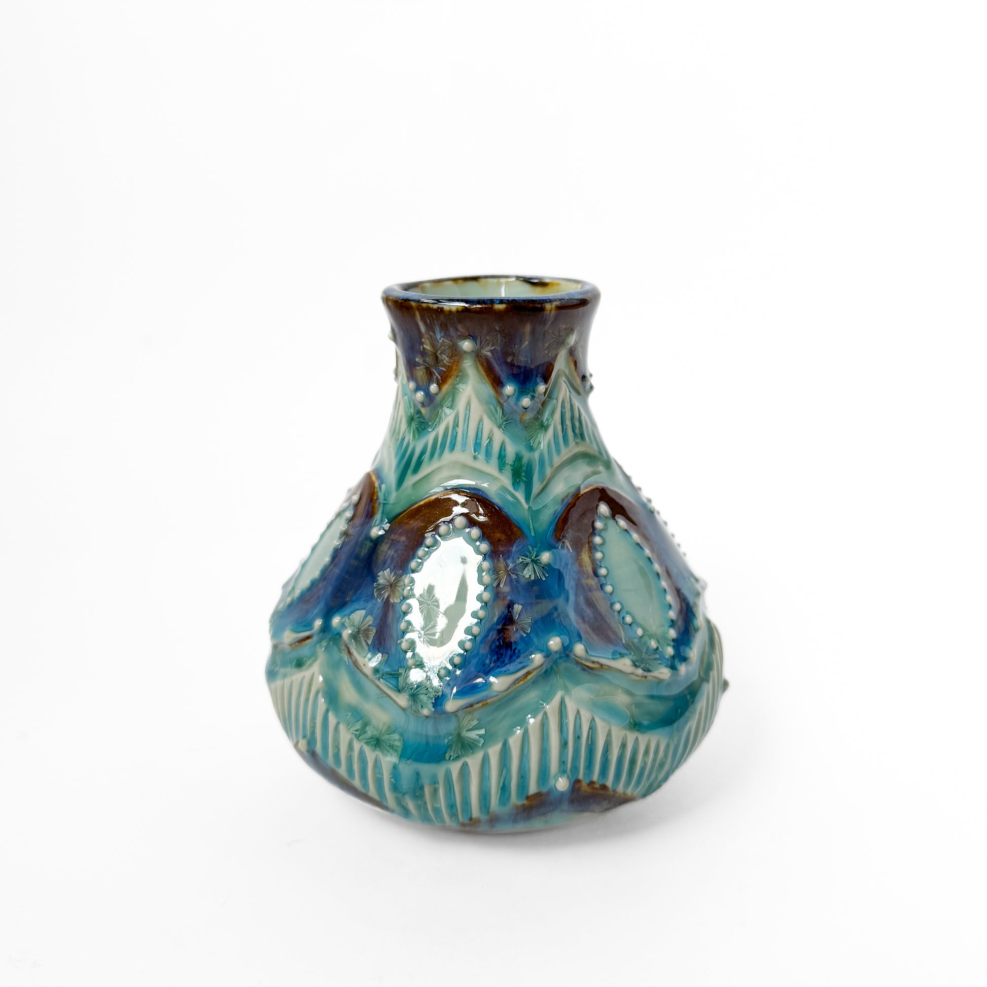 Wheel thrown vase with a geometric design made with carved lines, slip trailing, and iron slip. It has a green crystalline glaze.