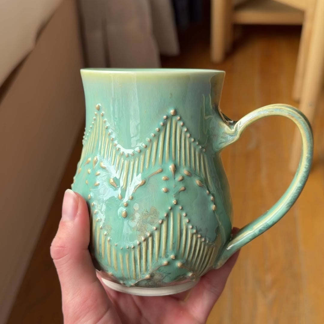 A wheel thrown porcelain mug with a zig zag pattern created by carved lines and slip trailing. It has a white liner glaze.