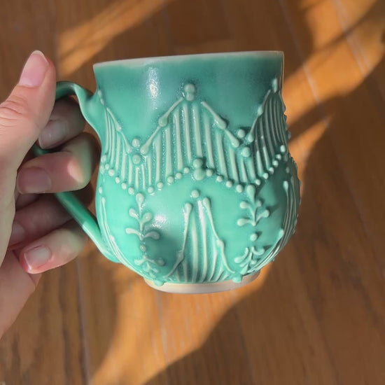A wheel thrown porcelain mug with a glossy white liner glaze and outer matte turquoise/teal glaze. It has a zig zag pattern created by carved lines and slip trailing.
