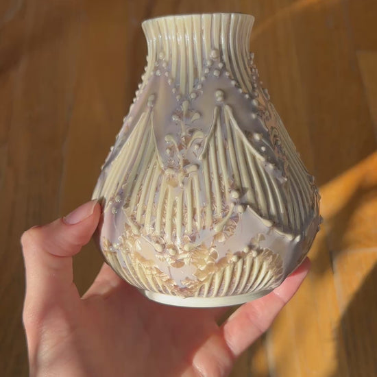 This is a wheel thrown porcelain vase with a purple glaze with gold crystals. It has a zig zag pattern created by carved lines and slip trailing. It's perfect for a small bouquet of flowers!