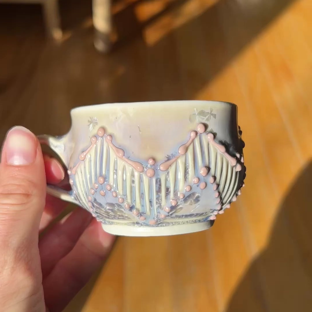 Wheel thrown porcelain teacup and saucer set in a purple crystalline glaze. The teacup has a glossy pink liner glaze. They are decorated with a textured zig zag pattern created by carved lines and slip trailing. This set is microwave and dishwasher safe, and the teacup holds 4oz.