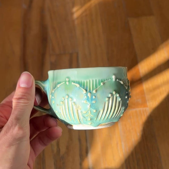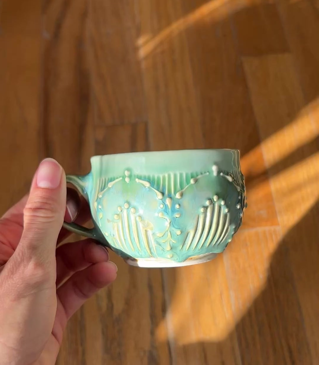 A wheel thrown porcelain teacup with a glossy white liner glaze and outer aqua glaze. It has a zig zag pattern created by carved lines and slip trailing. This is a slightly flawed discounted seconds piece, because it has a black marking on the inside bottom of the piece, but this should not affect its functionality.