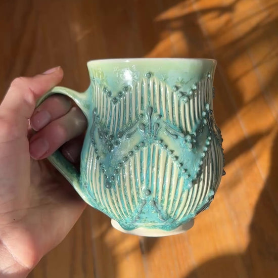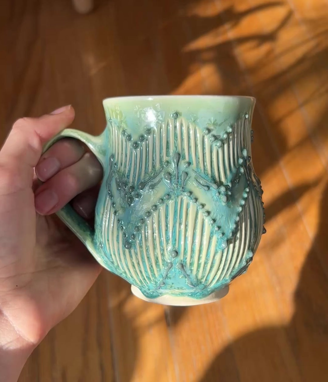 A wheel thrown porcelain mug with a glossy white liner glaze and turquoise crystalline glaze. It has a zig zag pattern created by carved lines and slip trailing. This is a slightly flawed discounted seconds piece because the rim is warped quite noticeably. This is only an aesthetic flaw, and this mug is perfectly functional.