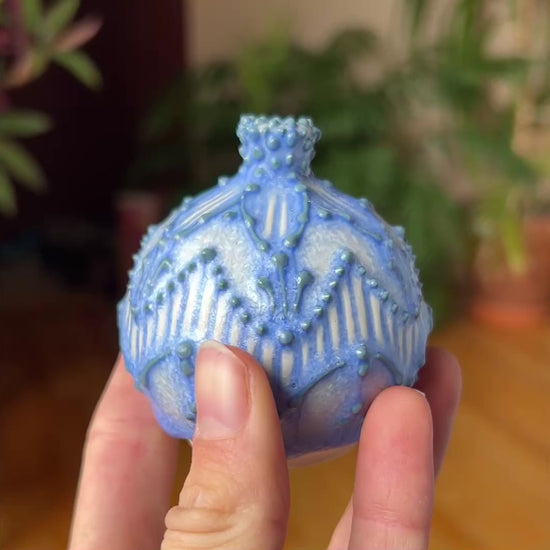 A wheel thrown porcelain vase with a narrow neck. It has a frosted blue glaze and a zig zag textured surface made from carved lines and slip trailing. It is open on top and can fit a small flower stem.