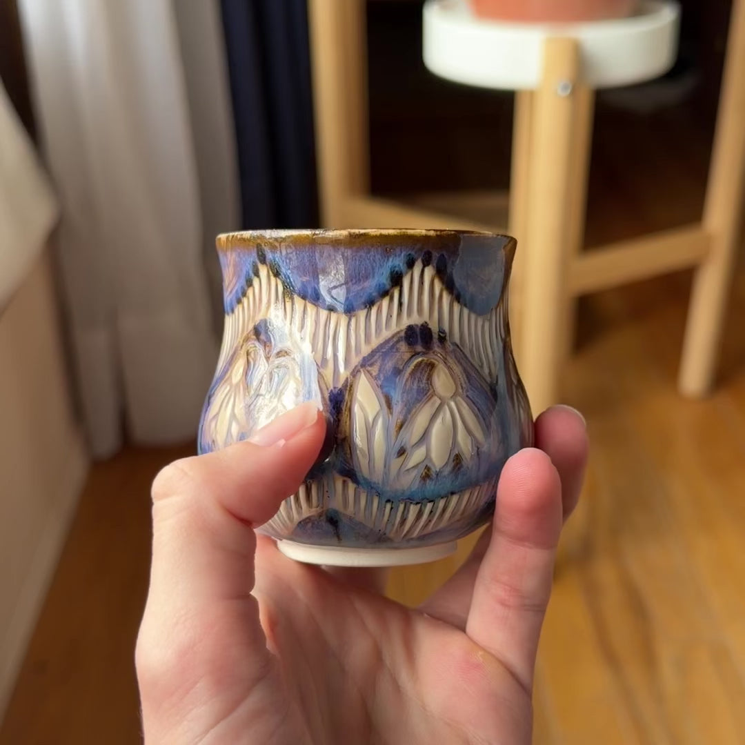A wheel thrown porcelain sipper with a flower design created by carving and iron.