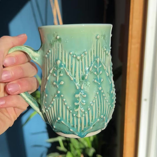 Wheel thrown porcelain mug with turquoise crystalline glaze and glossy white liner glaze. It has a textured zig zag pattern created by carved lines and slip trailing. It is microwave and dishwasher safe, and can hold 16oz.