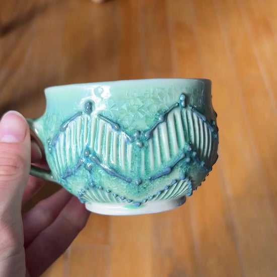 Wheel thrown porcelain teacup and saucer set with a turquoise crystalline glaze. The teacup has a glossy white liner glaze and a textured zig zag pattern created by carved lines and slip trailing. The set is microwave and dishwasher safe, and the teacup holds 8oz.