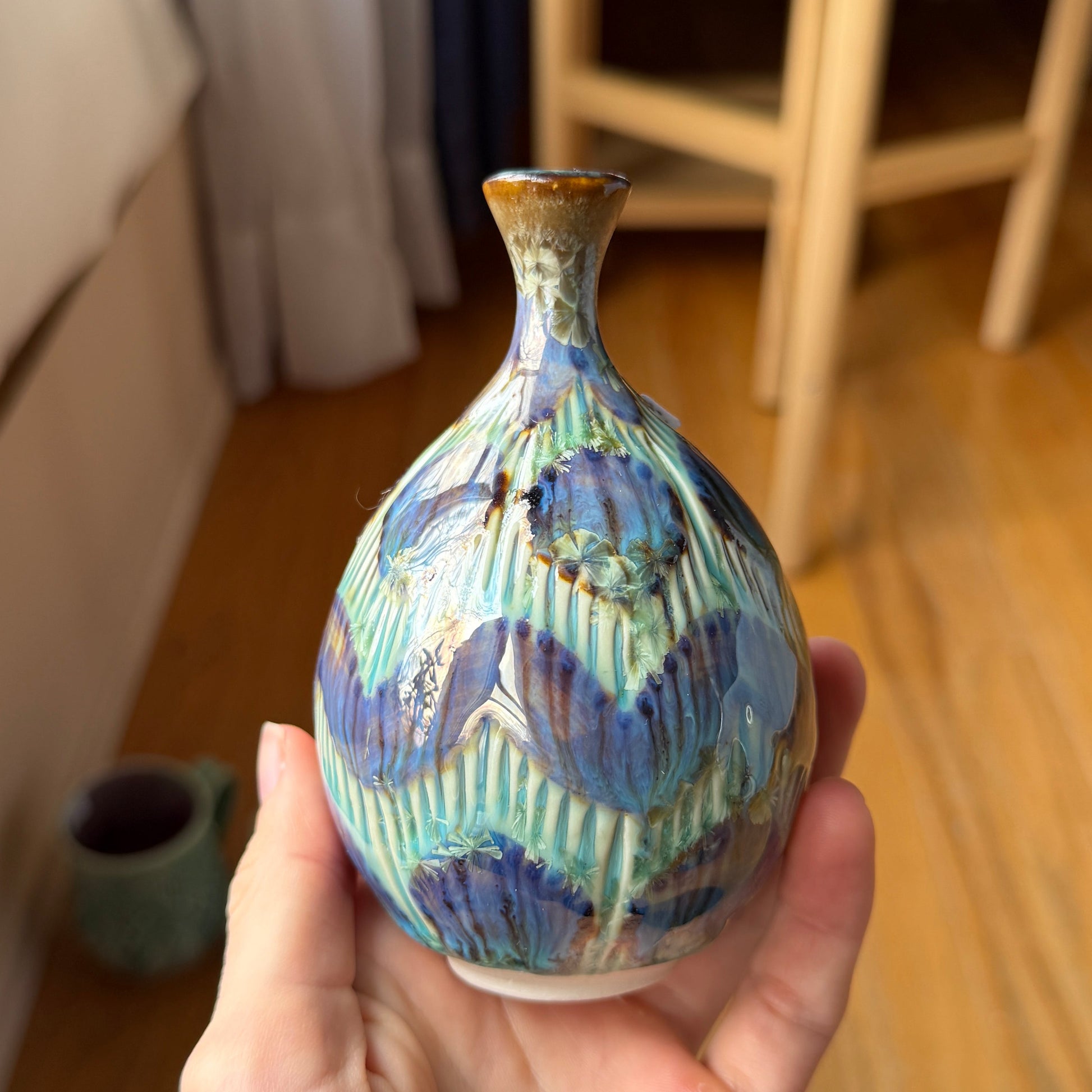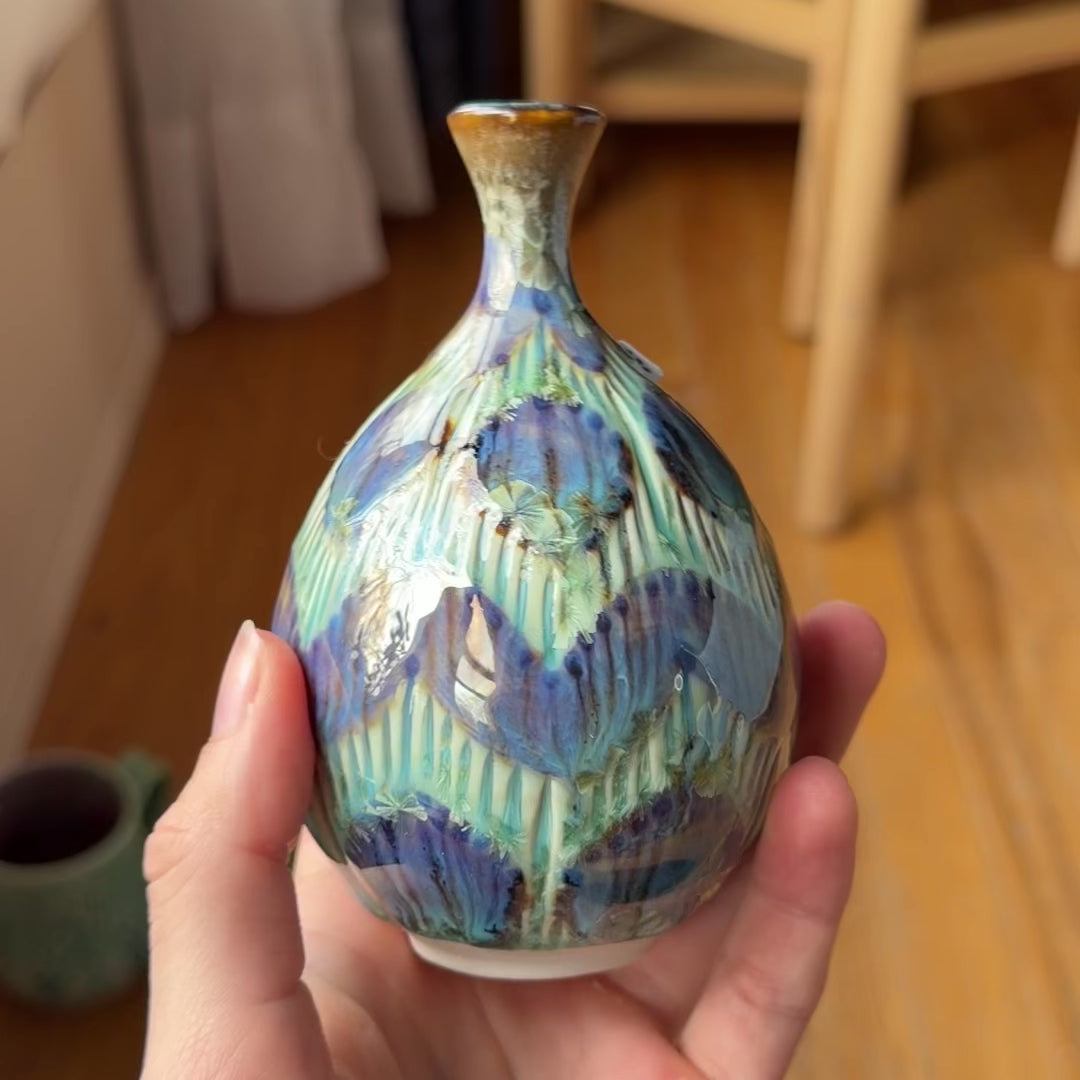 A wheel thrown porcelain bottle decorated with a geometric pattern created by carved lines and iron. It has a green crystalline glaze. The opening is not large enough to fit a flower stem.